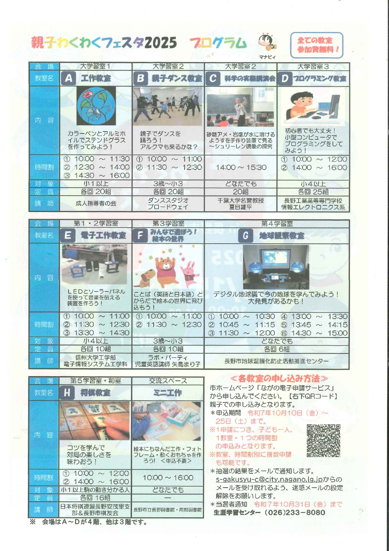 | 備考 | 長野市ホームページ「ながの電子申請サービス」からお申し込みください 照会先:生涯学習センター ℡026-233-8080 |